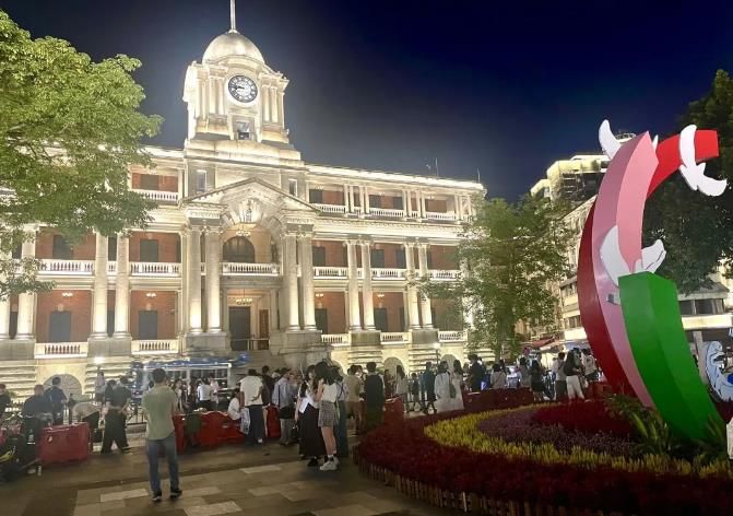 国庆夜的珠江风,带着水汽漫过沙面岛的界碑时,我便知这趟夜游会藏进记忆深处。青石板路被路灯染成暖金色,脚下每一步都像踩在时光的褶皱里,一边是百年前的西洋旧梦,一边是当下的鲜活烟火。