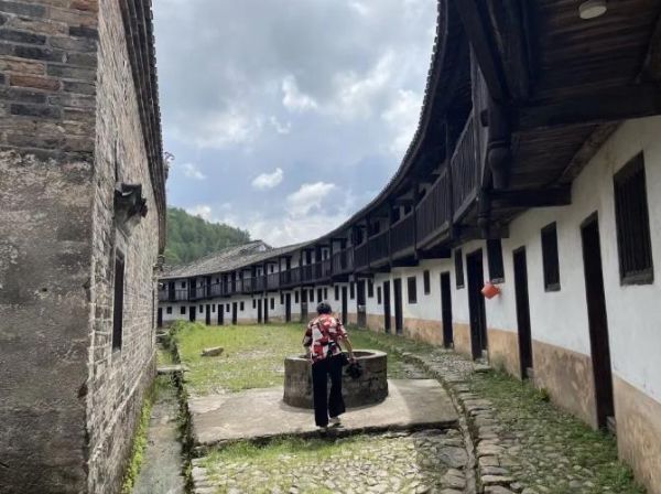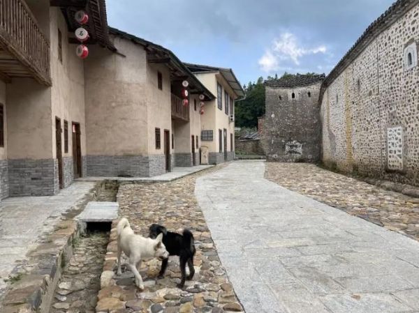 炊烟升起时,围屋便活了起来。客家女子身着蓝布衫,挑着盛满东水的木桶款款走过石板路,水桶晃动的涟漪里映着她们姣好的容颜,如水中芙蓉般清丽。吊脚楼下,年轻的母亲正低头喂奶,婴儿的吮吸声与檐下的鸟鸣交织,阳光透过木窗洒在她们身上,织就一幅温馨的生活画卷。黄狗忠诚地守在门边,偶尔抬眼望向游客,随即又耷拉着耳朵打盹,成了围屋最尽职的守护者。