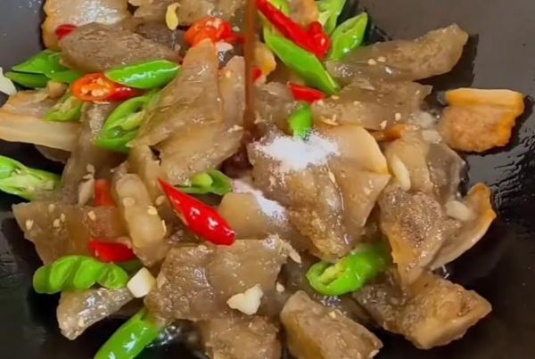 杨村地处赣南客家腹地,群山环抱间,客家文化如山间清泉,滋养着世代先民。客家人就地取材的生存智慧,在饮食中体现得淋漓尽致。蕃薯在山间沃土中蓬勃生长,收获后磨粉晒干,成为家家户户的常备食材。板盖丸的诞生,最初便是客家人应对农忙时节的巧思:薯粉易储存,制作工序简便,既能充当主食充饥,又可作为菜肴下饭,完美契合了客家先民勤劳节俭、粮菜兼备的生活哲学。炒制后的板盖丸,口感滑润弹牙,自带蕃薯的清甜。每逢过年过节或宴客,板盖丸搭配杨村米酒、清炖土鸡汤,便是一餐地道的客家风味,藏着客家人对生活最质朴的热爱。