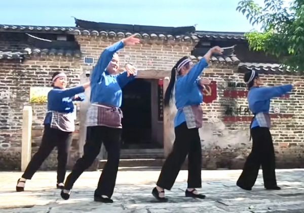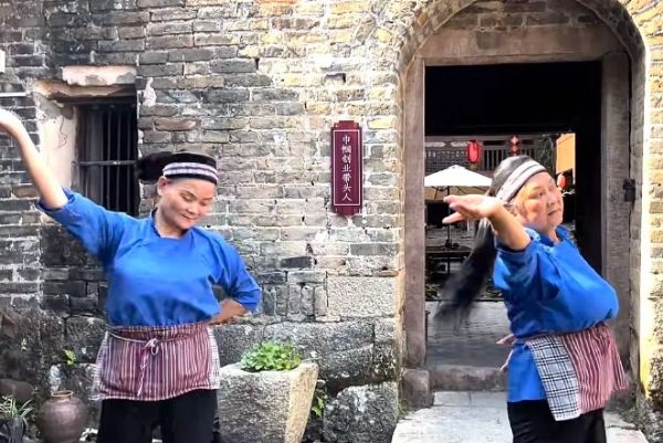 蓝衫妇女们的表演,是柔情与刚劲的完美交融。她们的蓝色客家服装,采用本地织就的土布,经靛蓝染料反复浸染,色泽温润而沉稳,既透着客家服饰的传统韵味,又衬得表演者身姿窈窕。演唱时,她们腰肢轻摆如春风拂柳,眼神温柔似山间清泉,将客家妇女的柔情融入每一个音符;而当唱到激昂处,身姿陡然挺拔如围屋的花岗石柱,声调高亢有力,尽显客家人的刚劲风骨。唱到“千军万马河边站,十万百姓泪汪汪”时,她们的歌声带着隐忍的哽咽,指尖轻轻划过衣摆,仿佛在诉说着革命岁月里的离别与牵挂;唱到“革命成功早回乡,回乡看望众乡亲”时,声调陡然上扬,脚步踏响节拍,蓝衫在风中翻飞,将对胜利的期盼与坚韧的信念传递给在场每一位游客。这种刚柔并济的表演,让红色歌舞脱离了刻板的宣讲,变得鲜活而有感染力,也让央视的九次专题报道更具纪实质感与传播力。