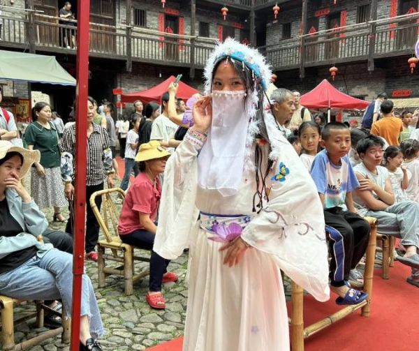 青砖黛瓦环伺的燕翼围下,潺潺太平江浸润着太平古镇的千年烟火,在这里生长的阿梅,她早已将客家文化的灵秀与醇厚融进骨血,以歌声传情、以舞姿表意,成为太平古镇里最鲜活的“客家围妹”符号。她身姿窈窕如围屋旁舒展的翠竹,眉眼含情似山间澄澈的清泉,无论是身着传统客家蓝便装,还是换上现代时尚服饰,都能绽放独属于客家女子的别样风华,用满腔热忱将客家文化的魅力播撒在每一位游客心间。